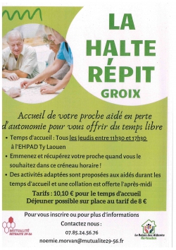 Un accueil de votre proche aidé en perte d'autonomie, vous est proposé tous les jeudis entre 11h30 et 17h30 à l'Ehpad Ty Laouen.