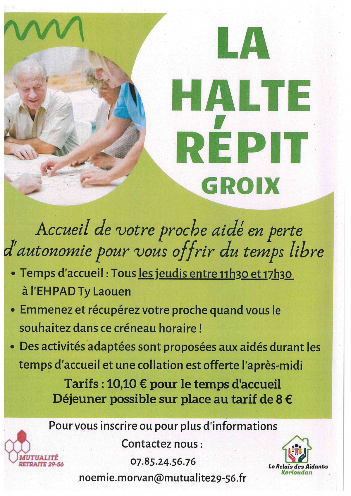 Un accueil de votre proche aidé en perte d'autonomie, vous est proposé tous les jeudis entre 11h30 et 17h30 à l'Ehpad Ty Laouen.
