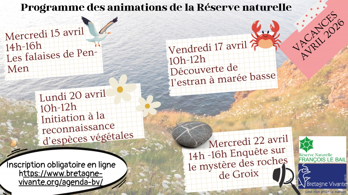 - mercredi 15 avril de 14h à 16h: découverte des falaises de Pen-Men