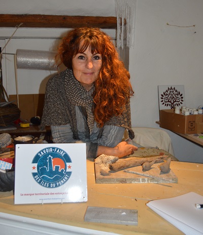 En 2017, elle s'installe au bourg dans une galerie « le rouget de l'île ». Là on trouve une multitude de créations liées à la mer. Elle travaille la plaque de lave qui vient de Volvic qui résiste au temps et à la lumière. Les plaques émaillées sont fabriquées sur demande et peuvent être personnalisées, qu'elles soient plaque de maison, crédence de cuisine, plaque funéraire.